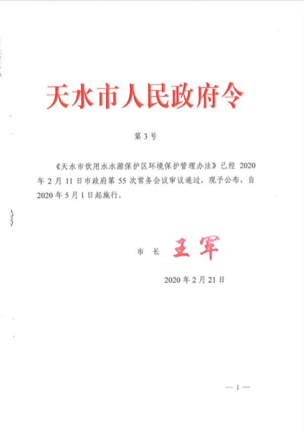 第四十九条 本办法自2020年5月1日起施行。2018年3月19日天水市人民政府第2号令《天水市饮用水水源保护区环境保护管理办法》同时废止。