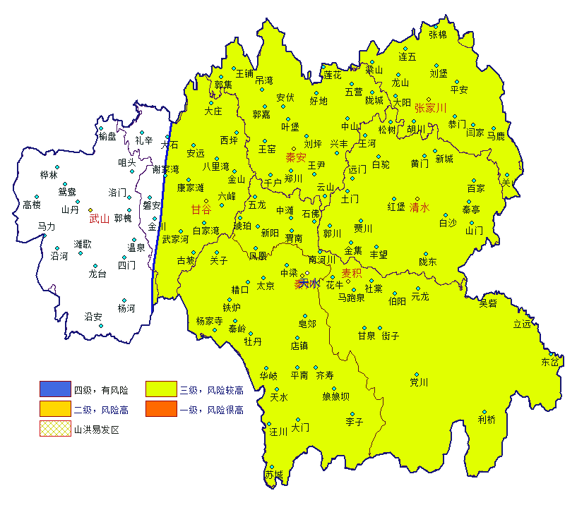 天水市气象台2020年8月6日16时00分发布暴雨黄色预警信号: 预计今天下午到夜间,我市甘谷县东部、秦安县南部、清水县、张家川县、秦州区、麦积区部分乡镇累计雨量将超过50毫米,发生滑坡、泥石流、山洪等次生灾害的气象风险较高,请有关单位及时采取防范措施。 天水市气象防灾减灾指挥部与天水市防汛抗旱指挥部8月6日16时15分联合发布山洪灾害Ⅲ级(黄色)气象风险预警: 预计今天下午到夜间,我市甘谷县东部、秦安县南部、清水县、张家川县、秦州区、麦积区部分乡镇累计雨量将超过50毫米,上述地区发生山洪灾害的气象风险较高(黄色预警),请各县区做好监测预警,加强应对防范。