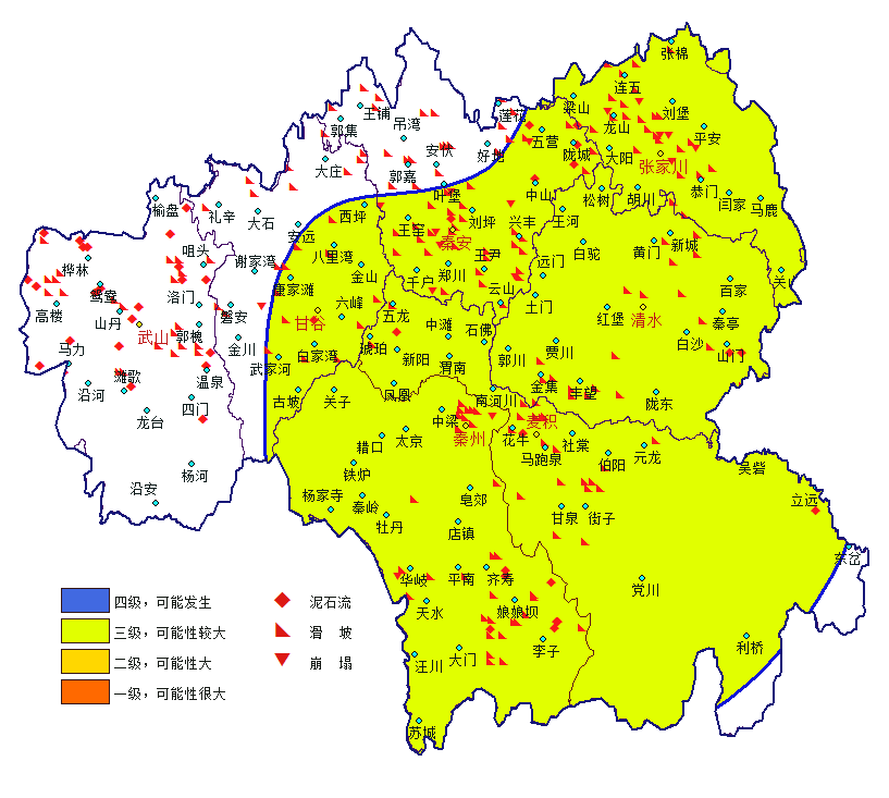 天水市自然资源局与天水市气象局8月6日16时30分联合发布地质灾害Ⅲ级(黄色)气象风险预警: 预计今天下午到夜间,我市甘谷县东部、秦安县南部、清水县、张家川县、秦州区、麦积区部分乡镇累计雨量将超过50毫米。上述地区发生地质灾害的气象风险较高(黄色预警),请相关县区做好监测预警,加强崩塌、滑坡、泥石流等地质灾害的应对防范工作。