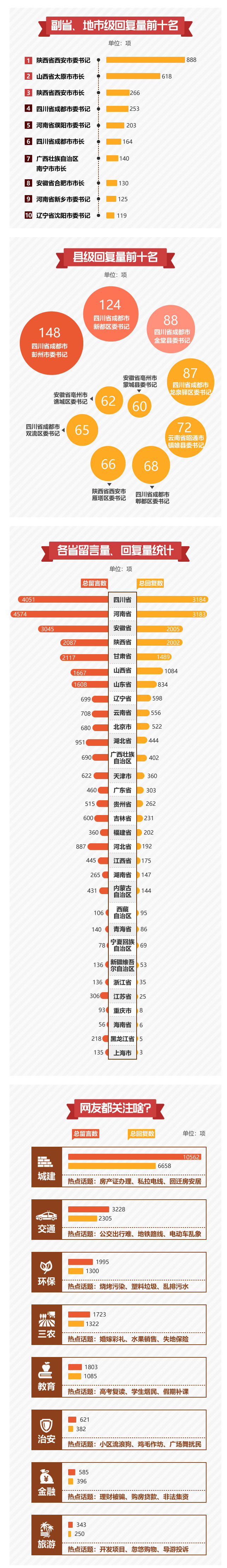 在副省、地市级领导回复排行榜上,陕西省西安市委书记以888项回复居首,山西省太原市市长、陕西省西安市市长同样进入该榜单前三位。