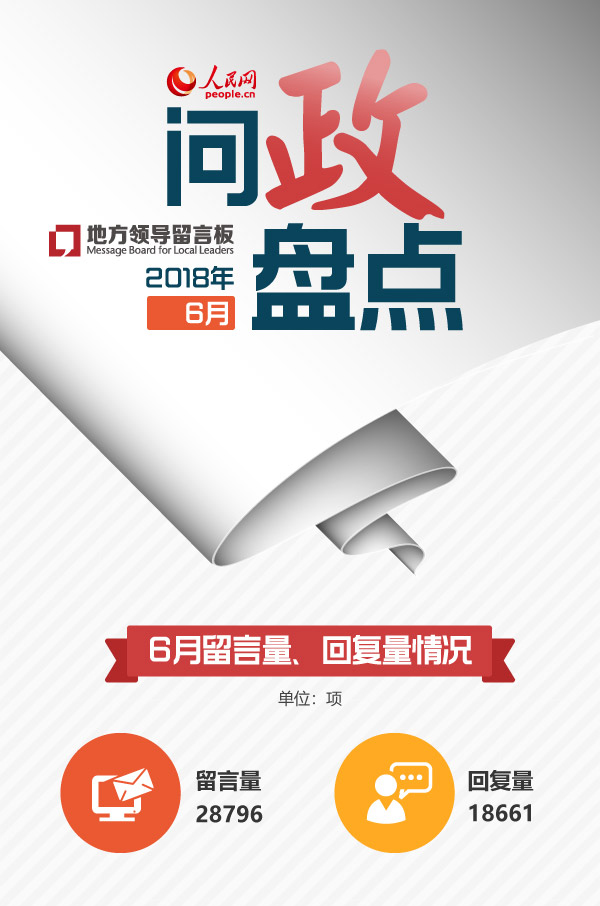 2018年6月,全国各地省市县三级党政“一把手”通过人民网《地方领导留言板》答复18661项网民留言,各地网民留言28796项。