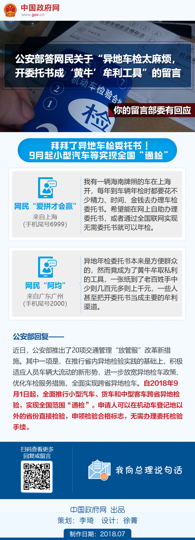 总理,您好。我有一辆海南牌照的车在上海开,每年到车辆年检时都要花不少精力、时间、金钱去办理车辆委托书。海南牌照的车辆找人代办委托书特别贵,所以每年到车辆要年检的时候都特别烦恼。希望能在网上自助办理委托书,或者通过全国联网实现无需委托书就可以年检,方便异地年检的司机。谢谢!