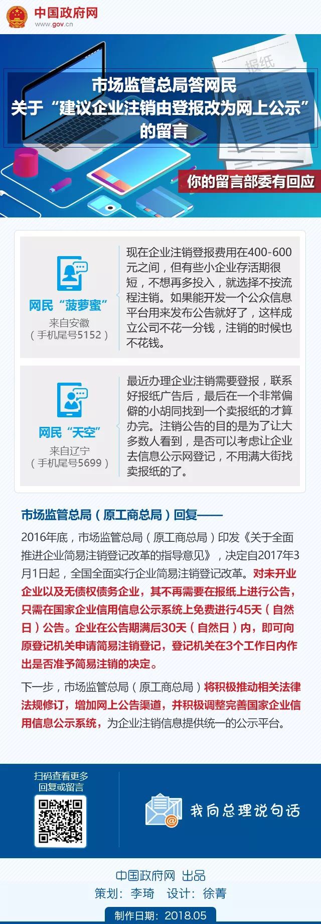 下一步,市场监管总局(原工商总局)将积极推动相关法律法规修订,增加网上公告渠道,并积极调整完善国家企业信用信息公示系统,为企业注销信息提供统一的公示平台,以方便社会公众查询,降低各类市场主体的办事成本,满足群众需要。