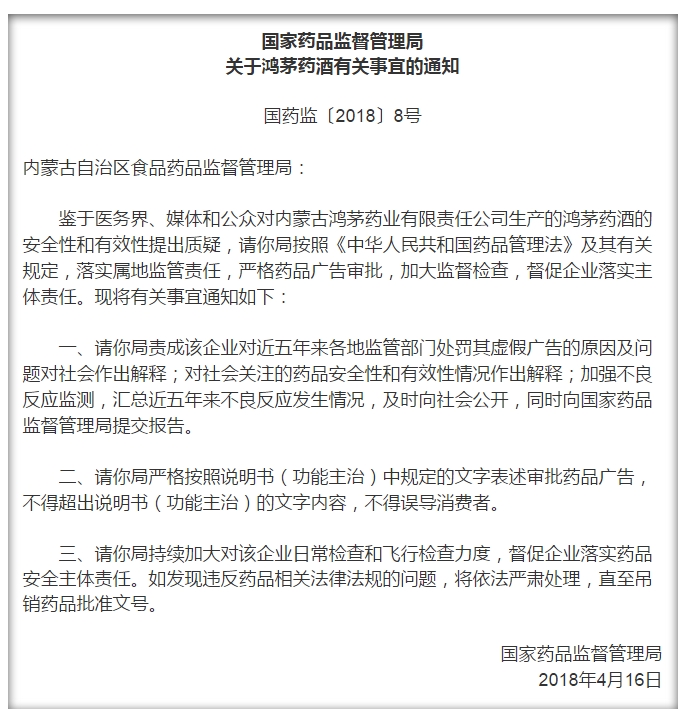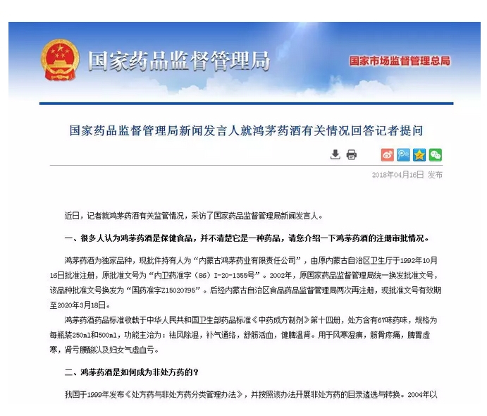 国家药监局回应鸿茅药酒有关情况