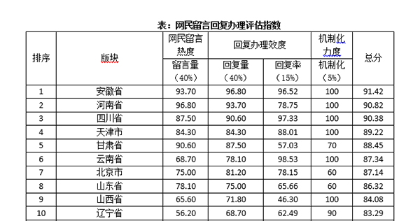 通过对网民留言情况、回复情况以及各省份在网民留言回复方面的机制化力度进行综合评估可以发现,安徽、河南和四川表现突出,位列榜单前三甲。此外,作为直辖市的天津和北京也取得了不错的成绩,分别位列第四名和第七名。甘肃、云南获得第五名和第六名。而山东、山西和辽宁分别排在第八名、第九名和第十名。