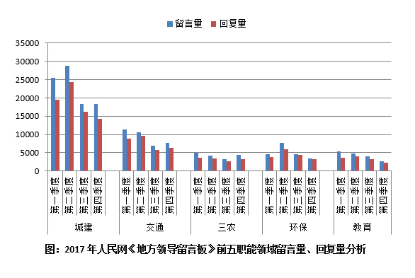 2017年各职能领域留言量分布中,留言量排名前五的领域有:城建、交通、环保、三农、教育。其中城建领域留言量达9万条,是排名第二的交通领域的两倍还要多。这五大职能领域的留言回复工作也取得了不错的成果,其中交通领域留言回复工作表现突出,留言量、回复量均排名第二,回复率居于榜首。