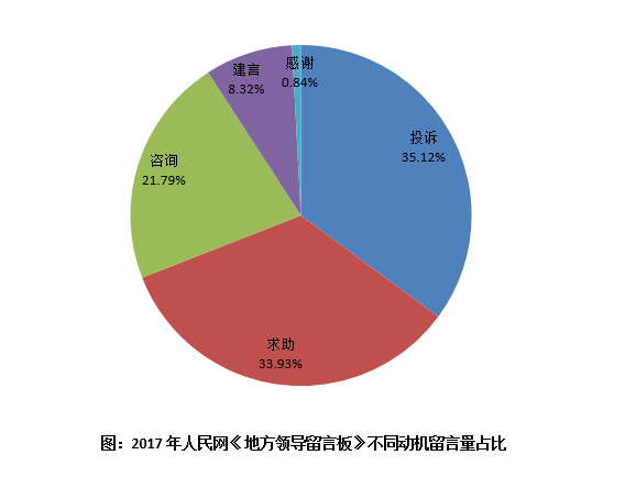 从网民的留言动机看,2017年网民在人民网《地方领导留言板》进行留言的主要动机是投诉和求助,留言量分别为:85858、82229。其次是咨询和建言,其留言量分别占总体的21.79%和8.32%。其中,咨询虽然留言量不多,但回复率是最高的。