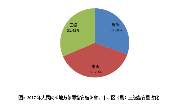 从行政层级角度观察,2017年省、市、区三级留言板的留言量分别达8.5万、10.7万、8.8万条。其中市级留言量最多,占总体的38.20%。其次是区级,占总体的31.42%。留言量最少的是省级留言板,占30.38%。而从留言的回复情况来看,省、市、区三级的回复量分别为:5.7万、9.1万、7.8万条,其中区级的回复率高达80.83%。