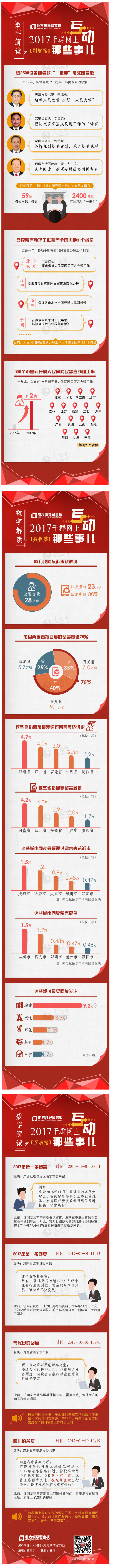 2017年,在这种“键对键”“心连心”的网上交流中,近23万件民生实事悄然解决。我们通过对《地方领导留言板》栏目一年数据的梳理,推出“数字解读2017干群网上互动那些事儿”。这些数字,可以看作是2017年各地领导干部通过互联网走群众路线的一张精彩答卷。