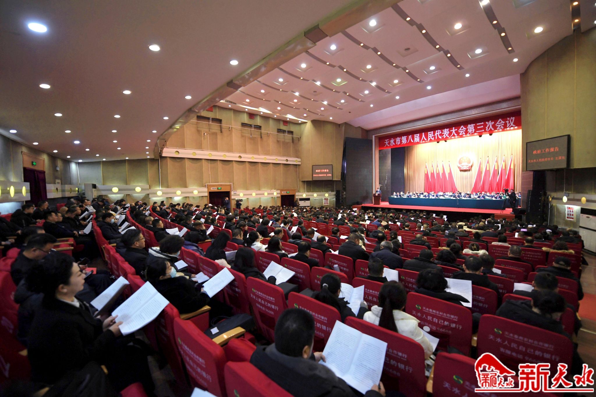 秦州剧院内气氛庄重热烈,主席台帷幕正中的国徽在鲜艳的红旗映衬下熠熠生辉。会场内悬挂着“以习近平新时代中国特色社会主义思想为指导,为谱写中国式现代化天水新篇章而努力奋斗!”的横幅标语鼓舞人心、催人奋进。