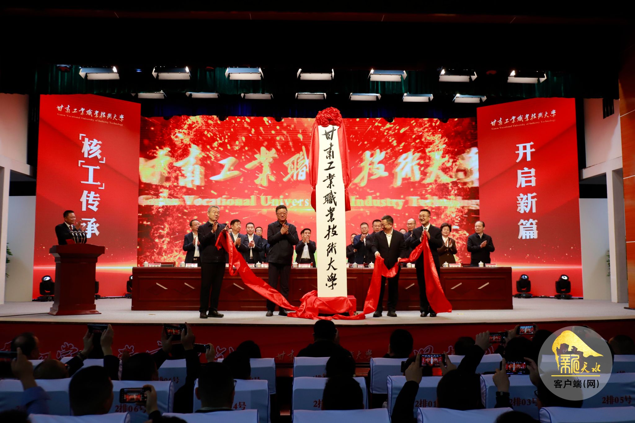 10月16日,甘肃工业职业技术大学高质量发展大会暨揭牌仪式举行。市委主要领导与工业和信息化部教育与考试中心、教育部学校规划建设发展中心、省教育厅相关领导共同为甘肃工业职业技术大学揭牌。省委机构编制委员会、省委军民融合办、市政府主要领导及分管领导、省职教协会以及兄弟院校代表、合作企业代表等出席揭牌仪式。