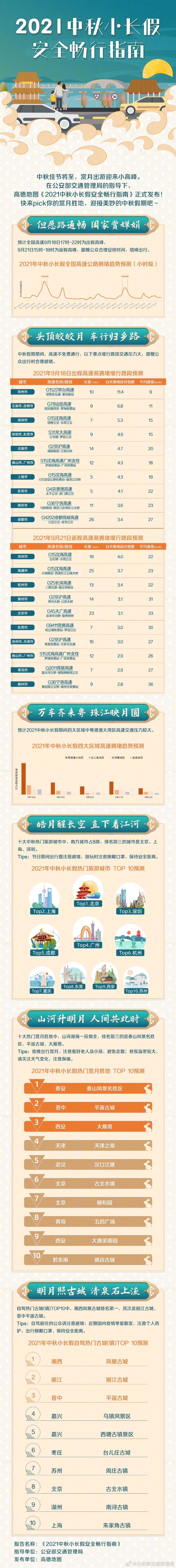 9月17日,在公安部交通管理局的指导下,基于对历年及近期交通大数据的分析预测,高德地图联合全国各地交警发布《2021中秋小长假安全畅行指南》(简称《指南》),为中秋小长假群众安全出行提供建议。