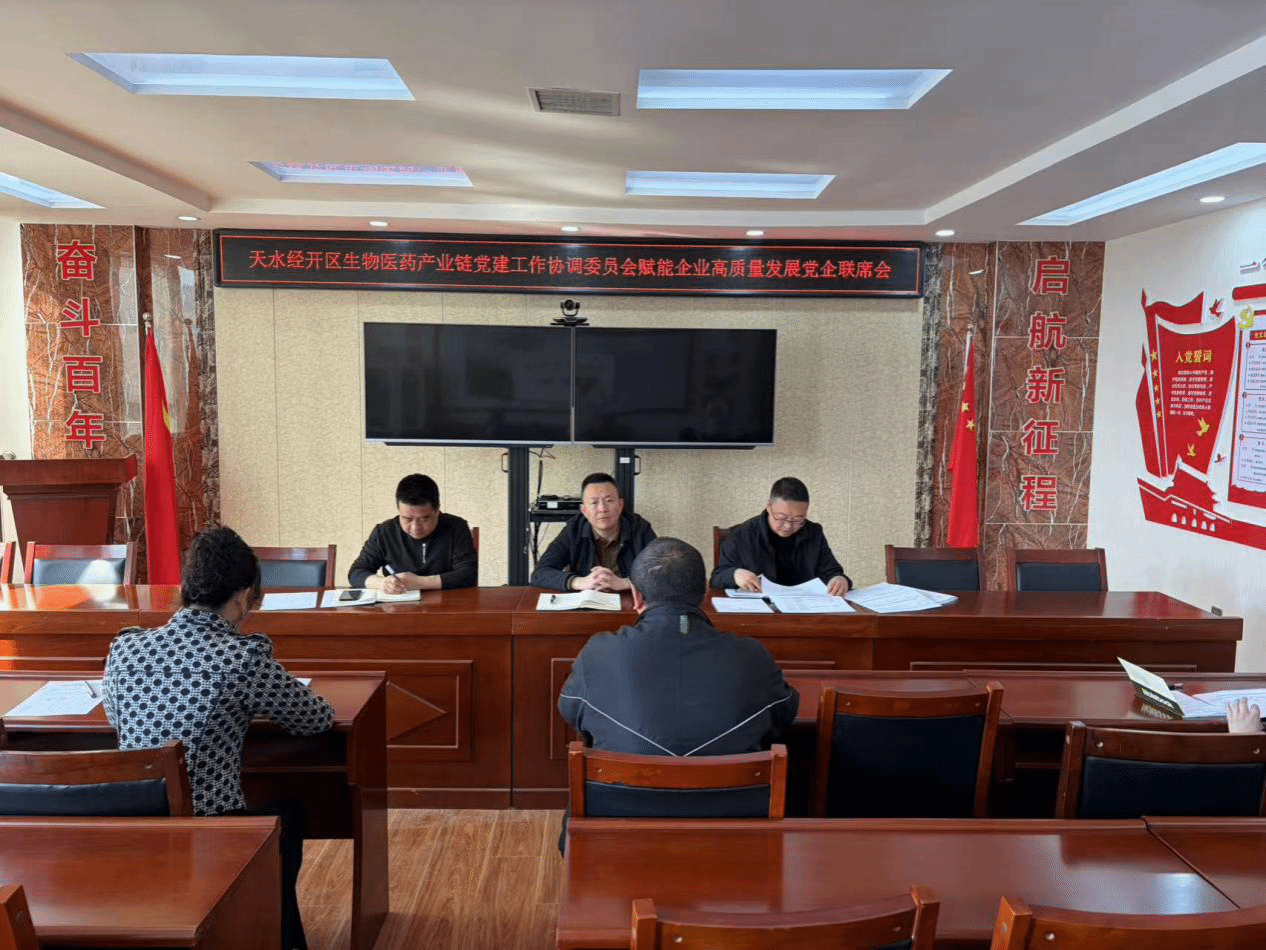 3月11日上午,财政局组织召开了生物医药产业链赋能企业高质量发展党企联席会议,党工委委员、管委会副主任李俊文,财政局党支部书记、局长王建军,以及天水岐黄药业、甘肃成纪生物药业、天水魏氏彤泰药业等链上重点企业党建负责人参会。