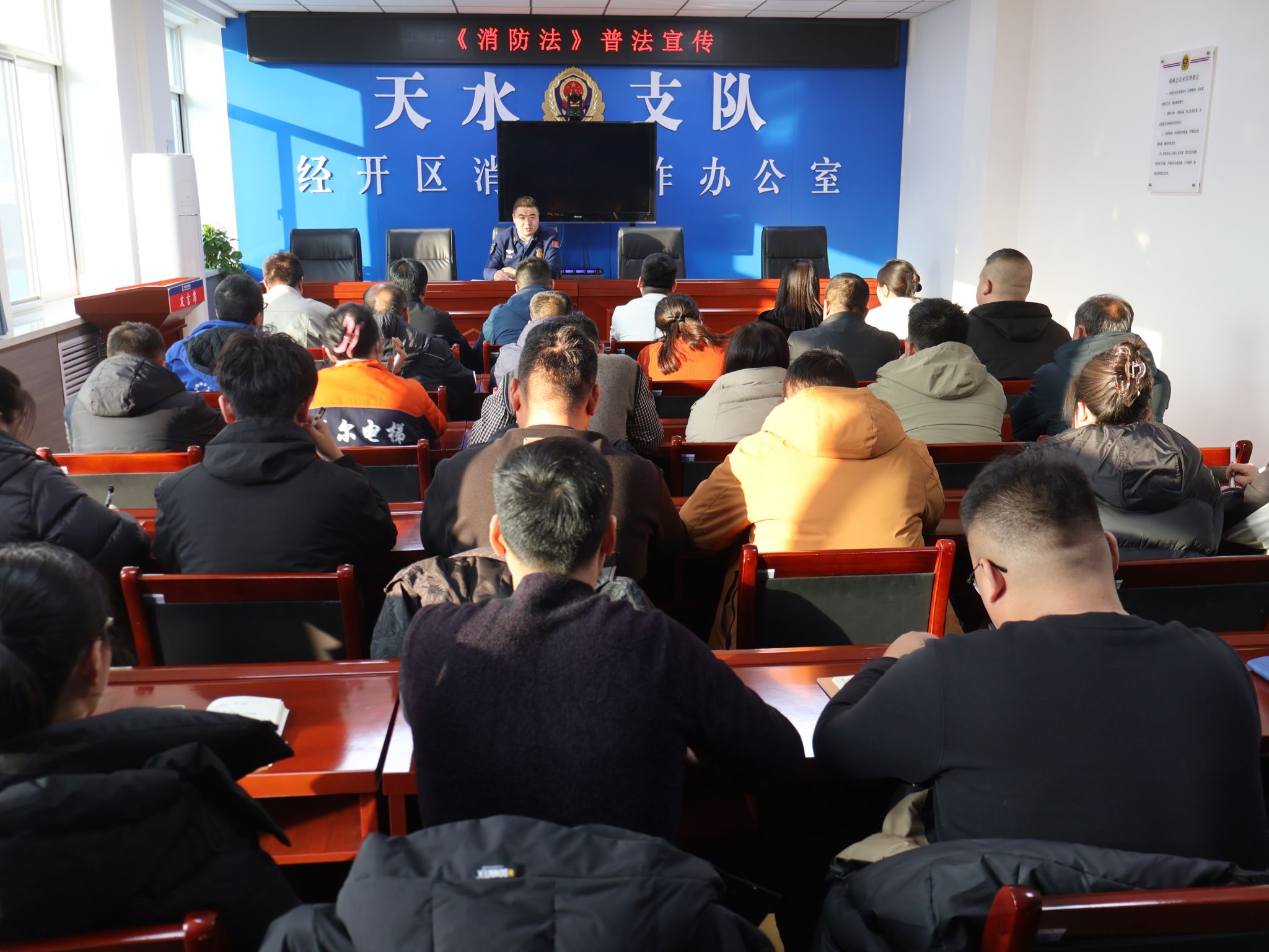 12月20日下午,天水经开区消防工作办公室组织开展《中华人民共和国消防法》普法宣传会,旨在提升企业人员消防安全意识与法律素养,强化企业消防安全管理。辖区各企业消防安全管理人参加此次普法宣传会。