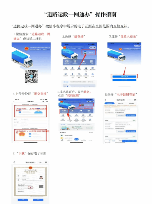 电子证照式样全国统一,凡道路运输电子证照可通过“道路运政一网通办”微信小程序进行申领及亮证亮码(见附件)。