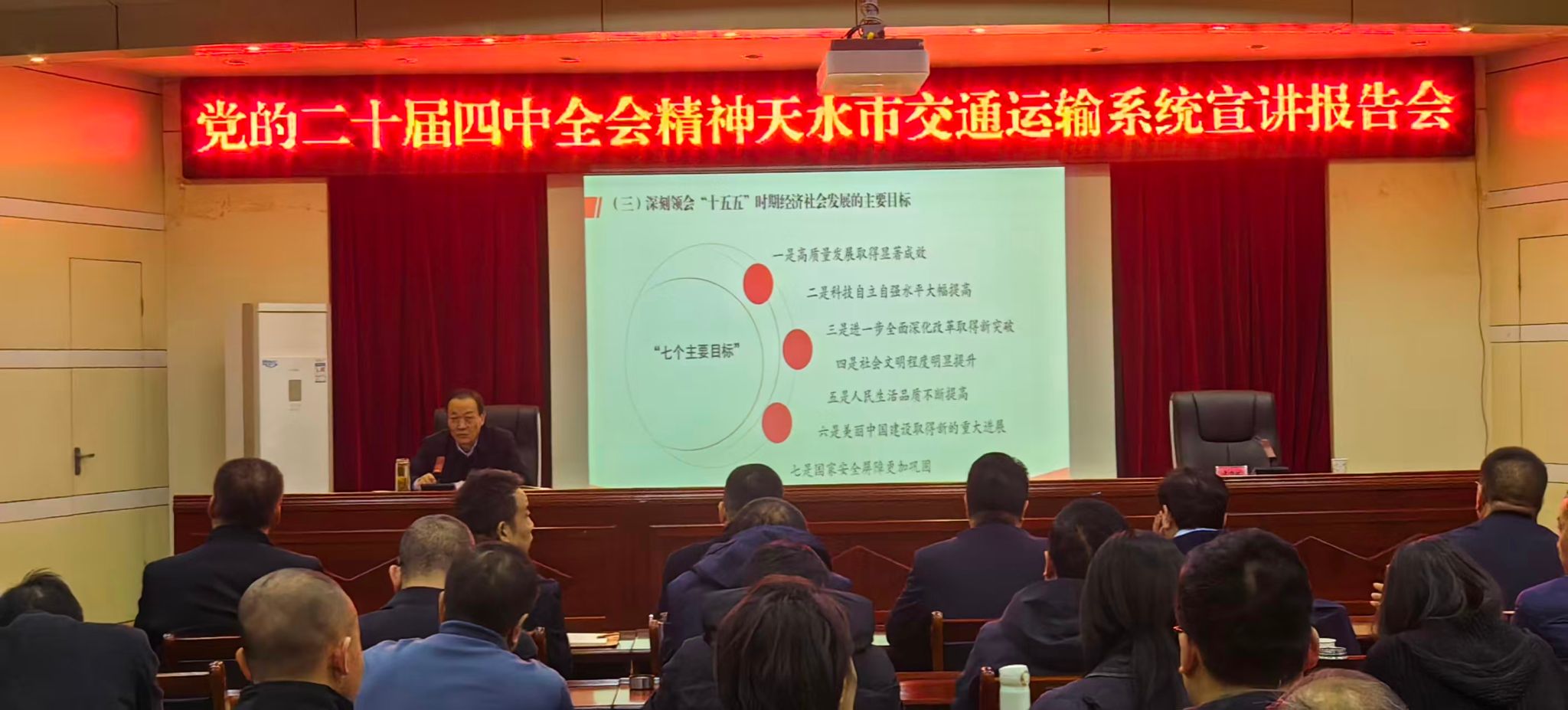 12月11日,天水市交通运输系统学习贯彻党的二十届四中全会精神宣讲会召开,局党组书记、局长秦永斌以“学悟四中全会精神 锚定发展谋局开篇 奋力开创交通强国建设天水实践新局面”为题,为全局干部职工和行业代表系统解读全会精神核心要义,交流探讨“十五五”时期交通运输发展实践路径,推动全会精神在交通运输领域走深走实。