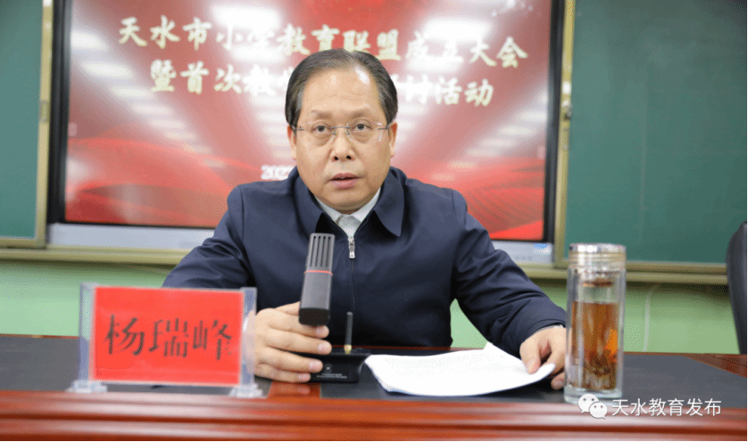 天水市委教育工委书记、市教育局党组书记杨瑞峰出席会议并宣布天水市小学教育联盟成立。市政府教育督导室专职副主任杨爱民出席宣读天水市小学教育联盟办学实施方案。