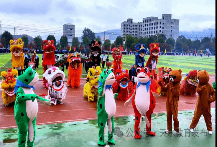 第19届亚运会举办之际,秦安第四中学第三届田径运动会开幕式上,由学生自编自演的开场舞“欢天喜地”的舞狮舞龙节目有点拉风,14头雄狮和1条火龙在绿茵场上翩翩起舞,不仅营造出了节奏明快的现场感,而且融入了体育、舞蹈等方面的中国艺术元素,烘托出了欢乐喜庆的效果,赢得了场上观众的热烈掌声。尤其是高三学生现身赛场。