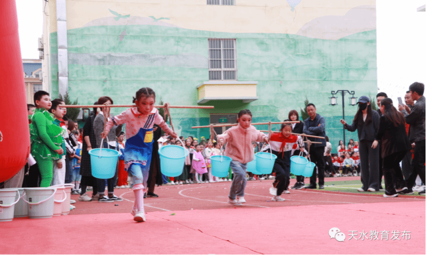 秦安县西川中心小学举办的秋季田园趣味运动会同样刷新了人们的认知。全校500名运动员参加3个大类15项比赛,《挑水灌溉忙》项目中的灌溉员肩挑水桶,背着装满玉米洋芋的小背篓你追我赶,热火朝天的劳动让运动会变得有趣,孩子们用身体的生动语言演绎着农民种植、管理、收割的场景,在充满泥土味的农耕生活氛围中进行沉浸式体验。