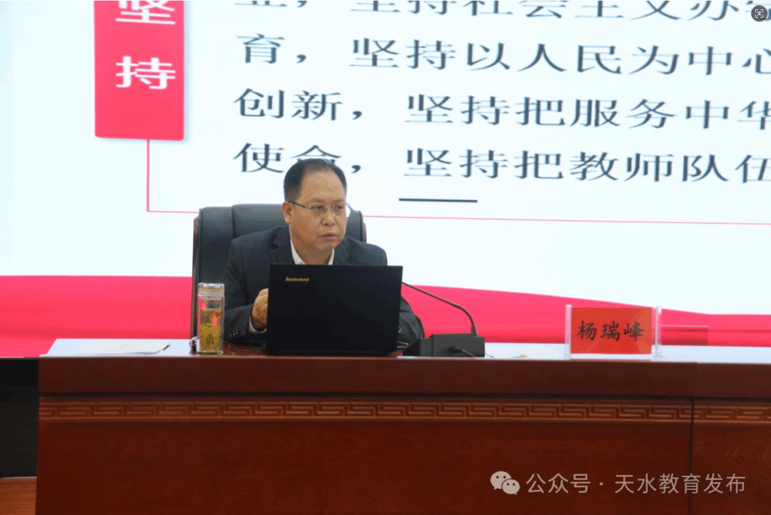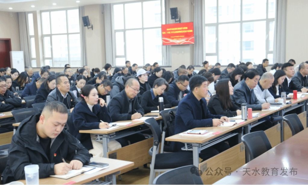 培训中,市委教育工委书记、市教育局党组书记、局长杨瑞峰作了《全面领会党的二十届三中全会精神,深化教育综合改革,奋力推动天水教育高质量发展》专题辅导。专题辅导围绕深刻理解“党的二十届三中全会和全国教育大会精神,明确今后我们‘改什么’”、“围绕天水教育发展实际,前期我们‘改了什么’”、“聚焦建设高质量教育体系,未来我们还要‘怎么改’”等方面,深入浅出地阐述了深化教育综合改革的重要意义,天水教育综合改革的主要做法以及立足天水教育现状,提出天水教育改革的思路举措。杨瑞峰强调,局直教育系统党员干部要讲求学习质效,努力学深悟透党的二十届三中全会和全国教育大会精神;要提升工作能力,学习领会掌握教育强国建设的一系列新思想、新观点、新论断,破解教书育人中的难点问题;要认真履职尽责,贯彻落实好大会精神,努力把学习成果转化为推动天水教育高质量发展的路径举措。