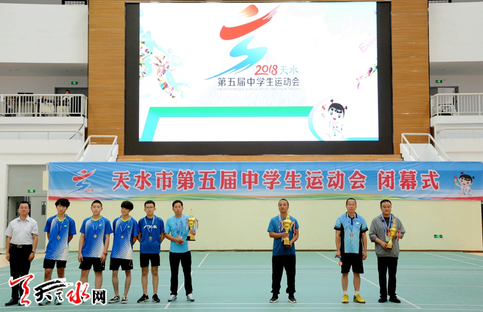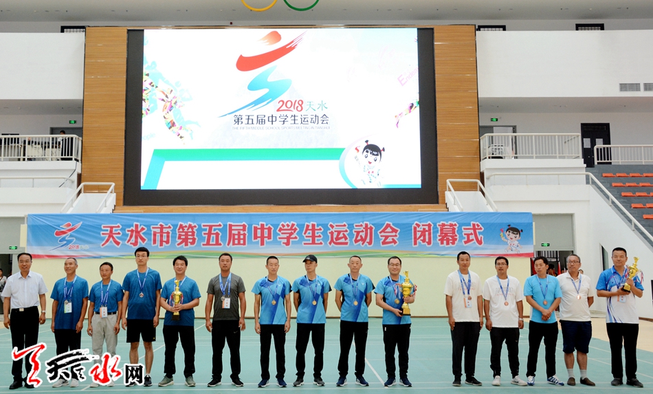 闭幕仪式上,本届中运会总裁判长蔡智忠宣布了天水市第五届中学生运动会各项竞赛成绩;市教育局副局长、市第五届中运会组委会委员王奎宣布了天水市第五届中学生运动会各项表彰决定;参加闭幕式的领导嘉宾为在本次中运会各类比赛中获得团体奖的单位与获得优秀组织奖、优秀辅导教师奖、优秀裁判奖、优秀运动员奖、学校体育工作优秀局长、校长奖,先进体育工作者奖、体育科学论文奖等奖项的单位与个人颁发了奖牌和奖杯,颁奖仪式与文体演出穿插进行。