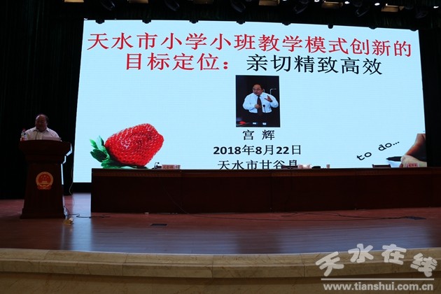 8月21日至22日,天水市农村边远地区小班教学改革及专项课题指导培训会在甘谷县举行。市委常委、副市长宫辉出席培训会并做专题讲座,要求着力打造亲切精致高效的小班教学模式,努力办好人民满意的教育。全市农村部分边远小学校长教师500多人参加培训。