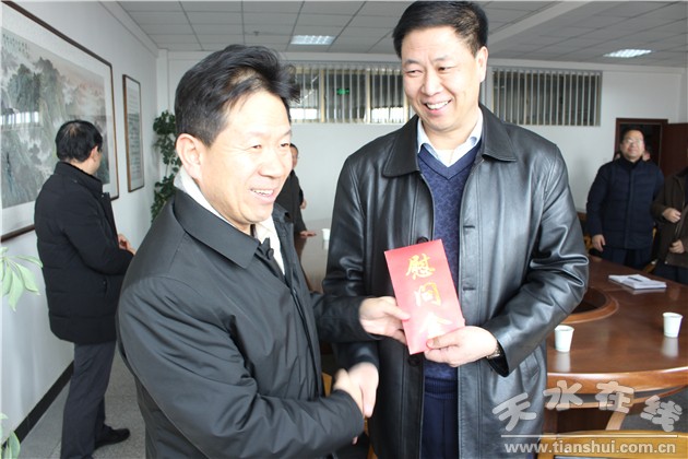 2月6日下午,天水市政协主席张明泰带领相关部门领导莅临天水一中慰问陇原名师石志学、全国模范教师马宗义。