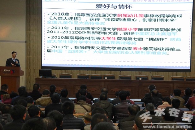 日前,天水市教育局和市科协联合举办了全市青少年学生科学创造力与创新能力培养模式探索报告会,全市乡镇中心小学以上学校校长和科学课教师共计640人参加了报告会。
