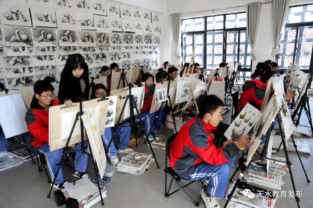 来到清水县第八中学,各个教室教学课程有序进行,老师们教得投入,学生们学得专心。专业课教室内美术、书法班的同学坐姿端正,一笔一画精雕细琢,教室内一幅幅老师和学生们创作的书法、绘画作品,引人驻足欣赏。