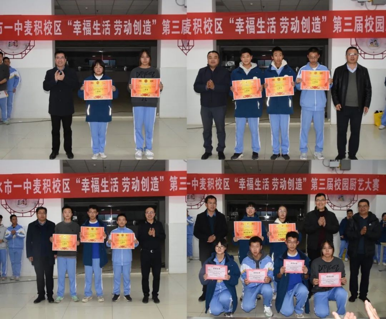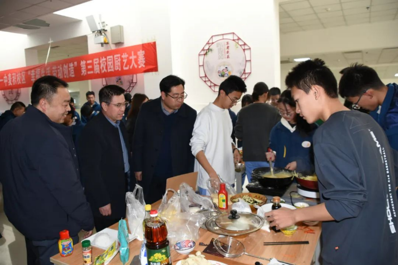 为落实五育并举、立德树人的根本任务,加强同学们对厨艺的了解,锻炼学生的劳动实践能力,在学校的大力支持和各部门的精心组织下,天水市一中麦积校区“幸福生活 劳动创造”第三届校园厨艺大赛"于12月1日下午在麦积校区食堂如期开展。学校领导班子,相关处室负责、级部负责人作为大赛评委出席了本次活动。高一级班主任,各战队参赛选手,学生大众评审团及班级后援团近200人参加了本次活动。