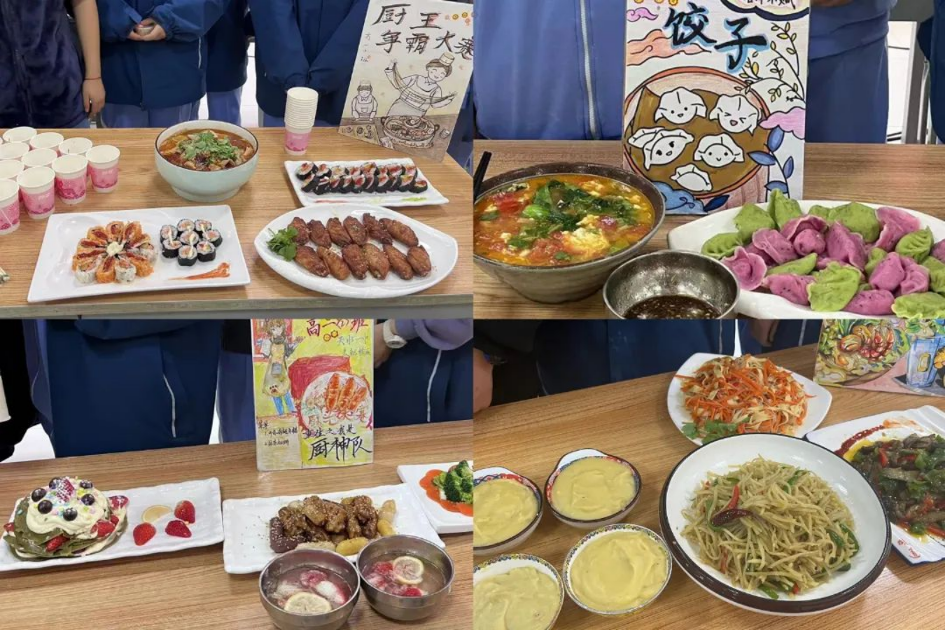 此次厨艺大赛以各班为战队,共有50名“学生厨师”参加比赛,比赛内容由主食和小食两个部分组成。每组选手需要在规定时间 (70分钟)内做出菜品。菜品制作完成后,各战队为菜品取名,厨师长对菜品进行介绍,再由评委及20位学生大众评审团成员鉴赏、品尝后给出相应分值贴纸。