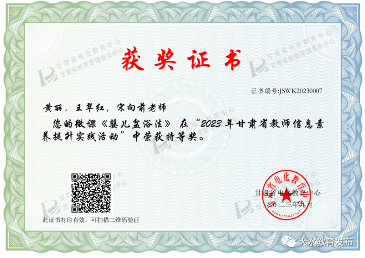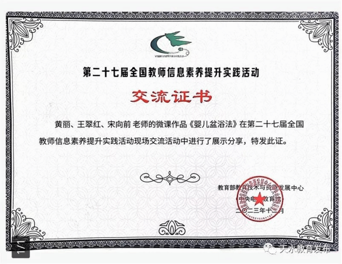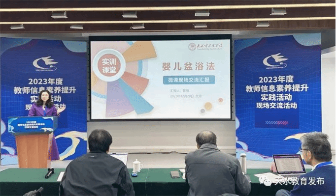 12月18-20日,由教育部教育技术与资源发展中心(中央电化教育管)主办的“2023年度教师信息素养提升实践活动”在北京举行。来自全国的教育管理者、名师代表、教师活动代表以及众多信息技术领域专家参加了交流、展示和分享活动。天水市卫生学校黄丽、王翠红、宋向前教师团队制作的《婴儿盆浴法》微课作品做为甘肃省唯一一部受邀作品参加了现场交流活动。该作品在2023年甘肃省教师信息素养提升实践活动中荣获微课赛项特等奖。