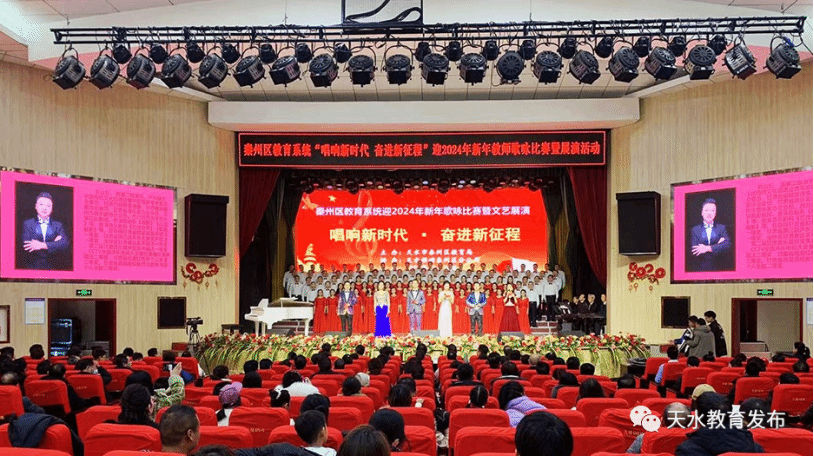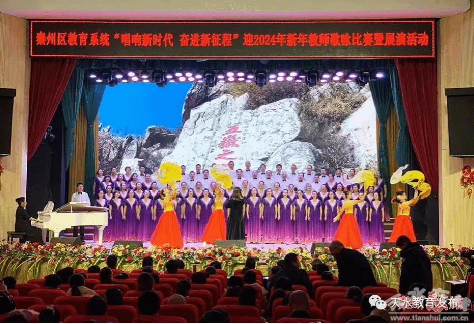 为切实加强全区教育系统精神文明建设,激发广大师生爱党爱国、昂扬向上的奋斗热情,集中展示新时代广大师生文明健康、开拓进取、积极向上的精神风貌,12月30日下午,秦州区教育系统以“唱响新时代·奋进新征程”为主题,举行迎新年歌咏比赛暨文艺展演活动。