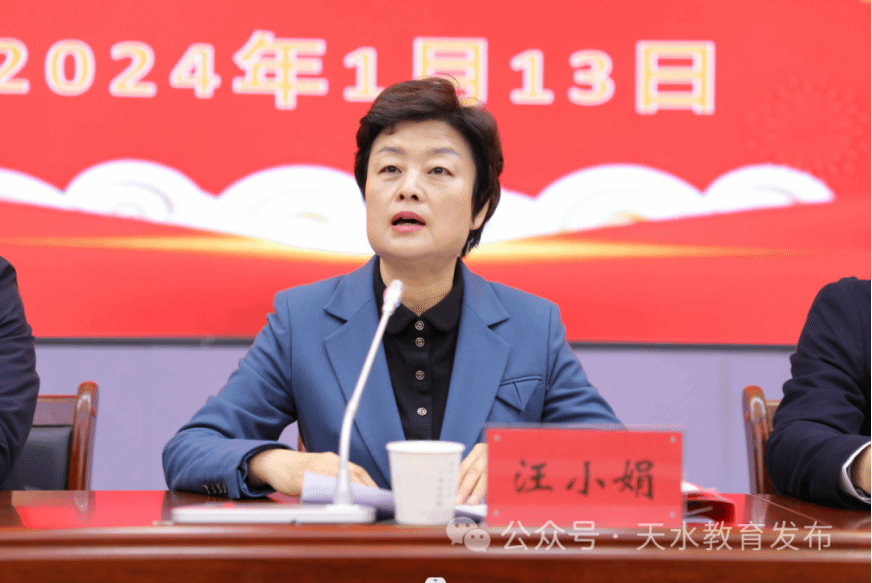 汪小娟在讲话中强调,当前,全市基础教育正处在爬坡过坎的关键发展期,也处在提质增速的重大机遇期,办好人民满意的优质教育,责任重大、使命光荣。希望天水市一中立足发展实际,探寻更加科学的学校发展方式,结合办学基础、发展愿景、课程资源等深入挖掘学校内涵特色;立足根本任务,聚焦学生核心素养培养,持续推进“五育并举”,着力培养德智体美劳全面发展的社会主义建设者和接班人;立足质量提升,以新课程、新教材、新高考“三新”改革为契机,大力实施科研兴校、人才立校、质量强校战略,打造高效智慧课堂;立足评价驱动,稳步推进综合素质评价和高考综合改革,营造更富活力的教育生态环境;坚持开放创新,借力社会资源,切实增强学校办学治校活力,努力办好人民群众更加满意的教育。同时,要加强人文关怀,关爱师生身心,大力营造和谐共进育人环境,让广大教职工在岗位上有幸福感、事业上有成就感、社会上有荣誉感。