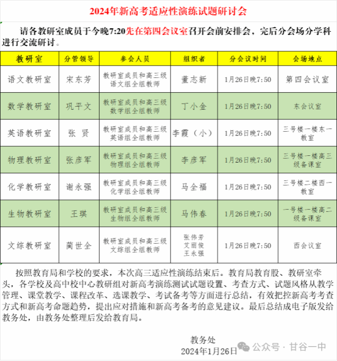 为精准把握新高考命题方向,做好与先行省份新高考试题的对比,有效推进一二轮复习的科学衔接,进一步提高复习备考的有效性和针对性,1月26日,甘谷一中召开了以“精研试题,把握趋势,明确思路,精准备考”为主题的2024年新高考适应性演练试题研讨会,九大学科教研室成员和全体高三级教师共计80余人参加。