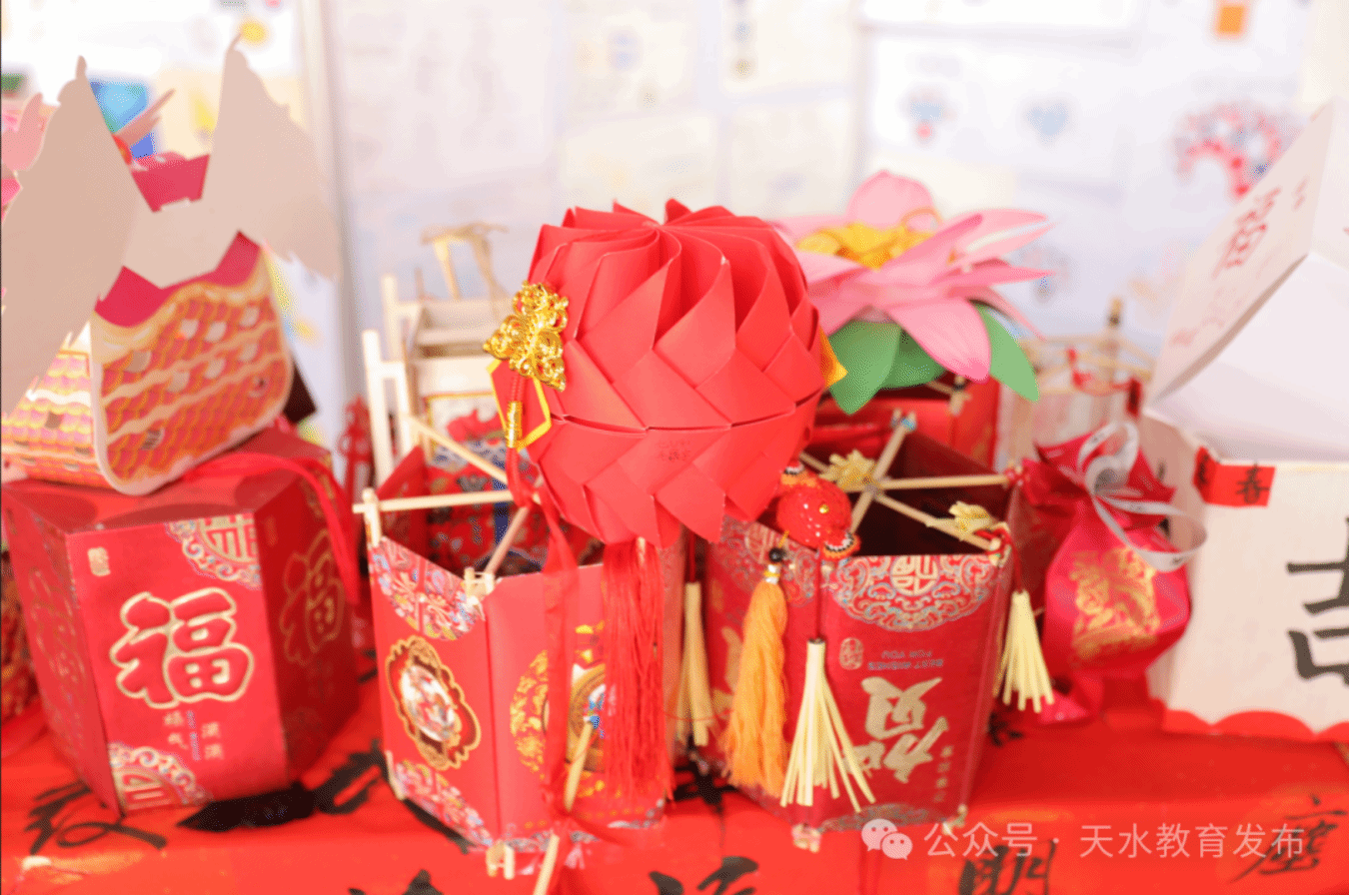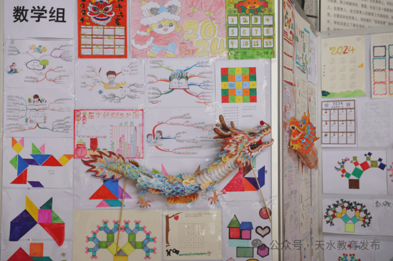 在数学板块展台上,摆满了孩子们创作的琳琅满目的迎春花灯、中国龙等手工作品,数学课玩起手工制作的花样手艺,不禁让人感到纳闷。