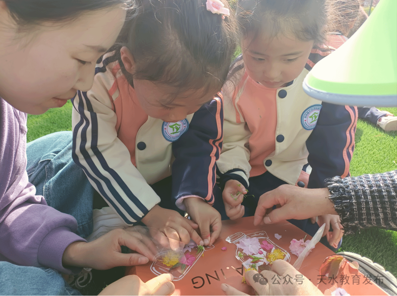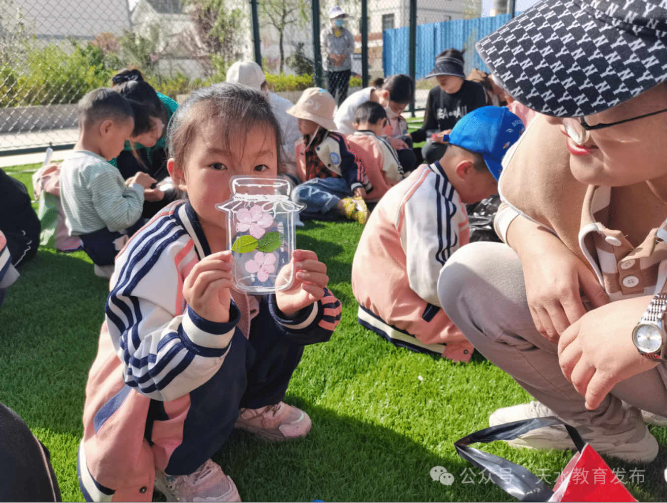 孩子们来到大石新村足球场,在家长和老师的安排引导下,开启了书签制作之旅,准备用自己的巧手定格下春天的美好,大家拿出提前准备好的“植物标本塑封膜”,耐心细致地取下自己在绿道上采集的一片片花瓣,小心翼翼地装进去,再配上一两片嫩绿的新叶,然后压紧压实,一个漂亮的植物标本书签便做成了,她们把春天的无比美好定格在了这看似简单的塑封袋中了。其实,这一刻,收获的喜悦和幸福也定格在了孩子们的脸上。