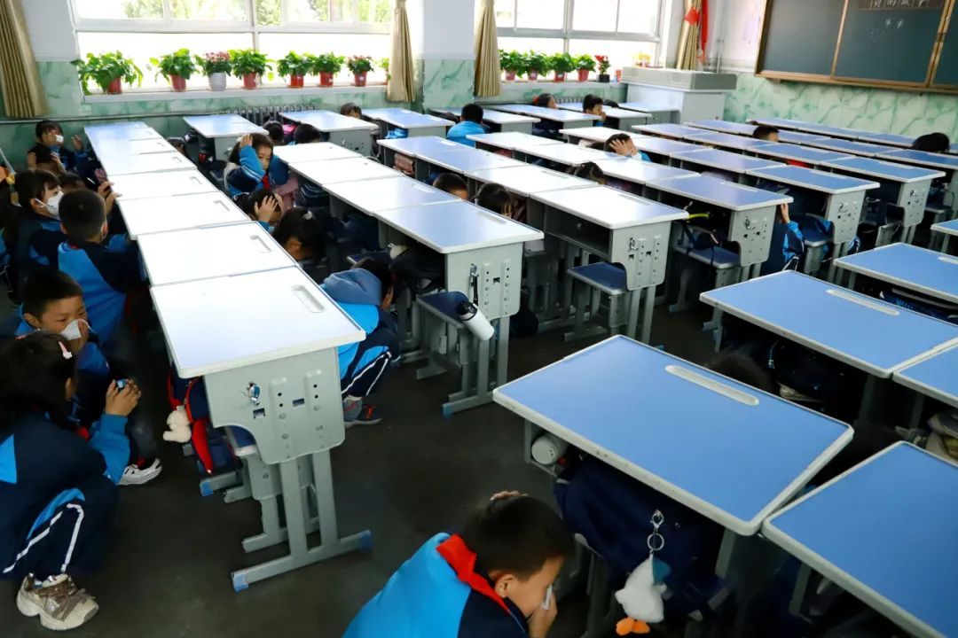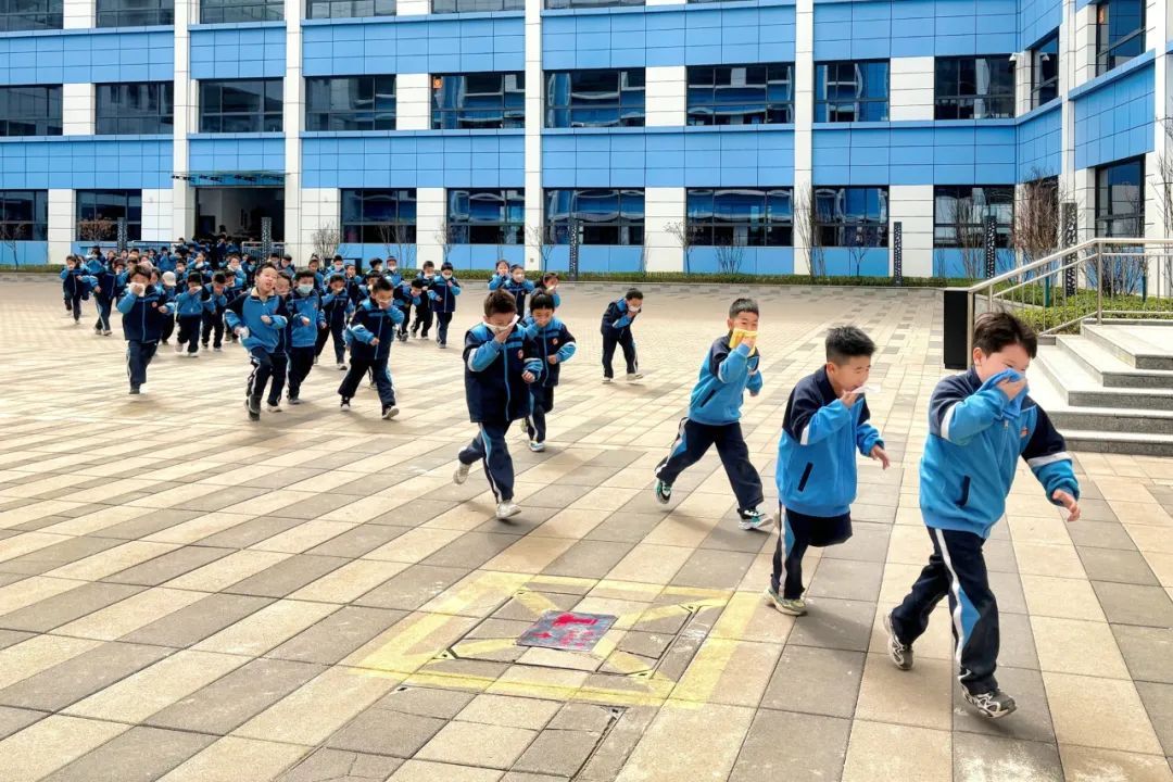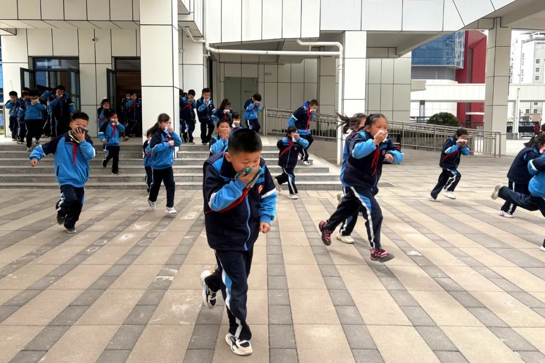 随着警报声瞬间响彻校园,教师们分工明确,坚守岗位,沉着冷静地指挥学生疏散,同学们在老师的引导下,迅速用手或湿巾捂住口鼻,低姿弯腰,沿着既定疏散路线,稳步有序地向安全区域撤离。整个过程迅速紧张而又井然有序,师生配合默契,学生均能按照演练要求撤离,没有出现抢道、拥挤和踩踏现象,展现出良好应急能力与协作精神。到达操场后,各班班主任迅速清点人数,并向现场总指挥报告。分校由班主任老师先对活动注意事项和路线对各班进行安全教育。随着一声哨响,全体学生抱头蹲下,第二声哨音后,参与演练的各班开始撤离。各班学生在各区域负责老师和班主任的指挥下,紧张有序,拿起湿纸巾或湿毛巾捂住口鼻弯腰跑步前行至操场集合。