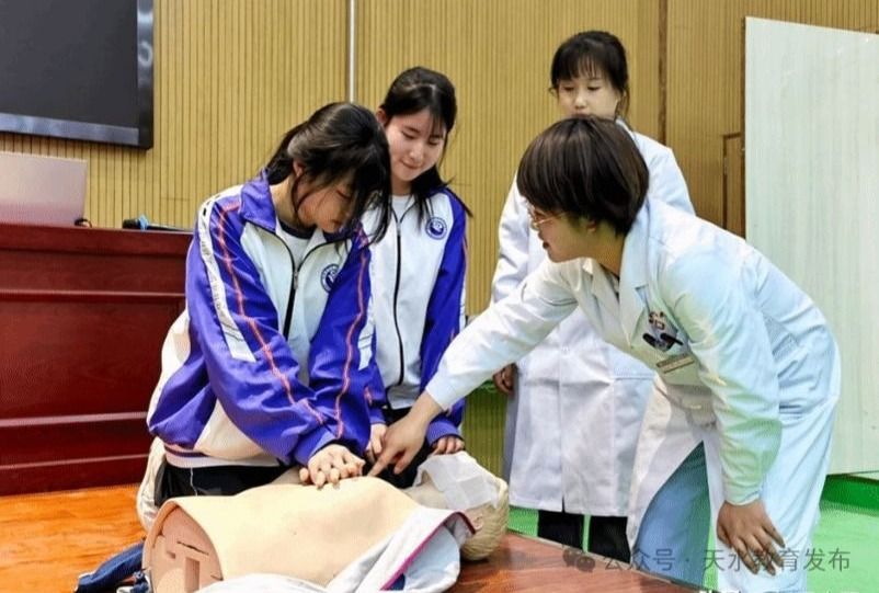 随后,麦积区北道埠街道社区卫生服务中心的医护人员现场演示了心肺复苏全过程。学生们凝神观看,并在互动环节主动上台尝试操作。在医生手把手的指导下,学生们很快掌握了技巧,现场气氛热烈。