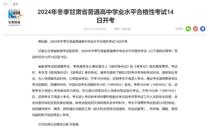 记者从甘肃省教育考试院获悉,2024年冬季甘肃省普通高中学业水平合格性考试(以下简称合格考)笔试时间为12月14日至15日。