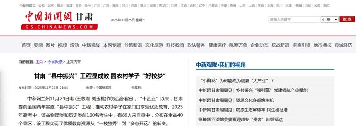 作为西部省份,“十四五”以来,甘肃提前全国两年实施“县中振兴”工程,推动农村学子在家门口享受优质教育。2025年高考中,该省物理类和历史类前100名考生中,有89人来自县中,分布在全省40个县区,该工程实现了优质教育资源从“一枝独秀”到“多点开花”的转变。