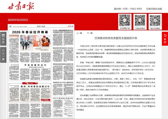 在科教融汇与成果转化方面,我省高标准推进教育部甘肃高等研究院建设,实施高校产业支撑计划“龙头对龙头”行动与青年博士教师“入企入园”行动,国家U40项目支持5所高校青年拔尖科技人才培养;实施高校区域技术转移转化中心试点工程,全年科技成果转化金额1.63亿元,同比增长19.85%;在全国率先出台40条政策清单,推进市域产教联合体、行业产教融合共同体建设。