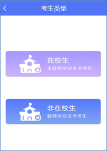 点击选择一种考生类型,“在校生或非在校生”,考生随后选根据考生户籍类型,选择“户籍考生/居住正考生”进入学信网学籍/学历验证码校验。