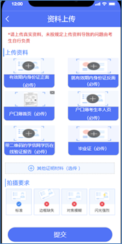 居住地为本市的非在校生:请上传居民身份证(需在有效期内)正面及反面,居住证原件(仅有回执没有证件不能报名,居住证要在有效期内),毕业证,带二维码的学历认证报告(不需要学位证和学位认证报告)。