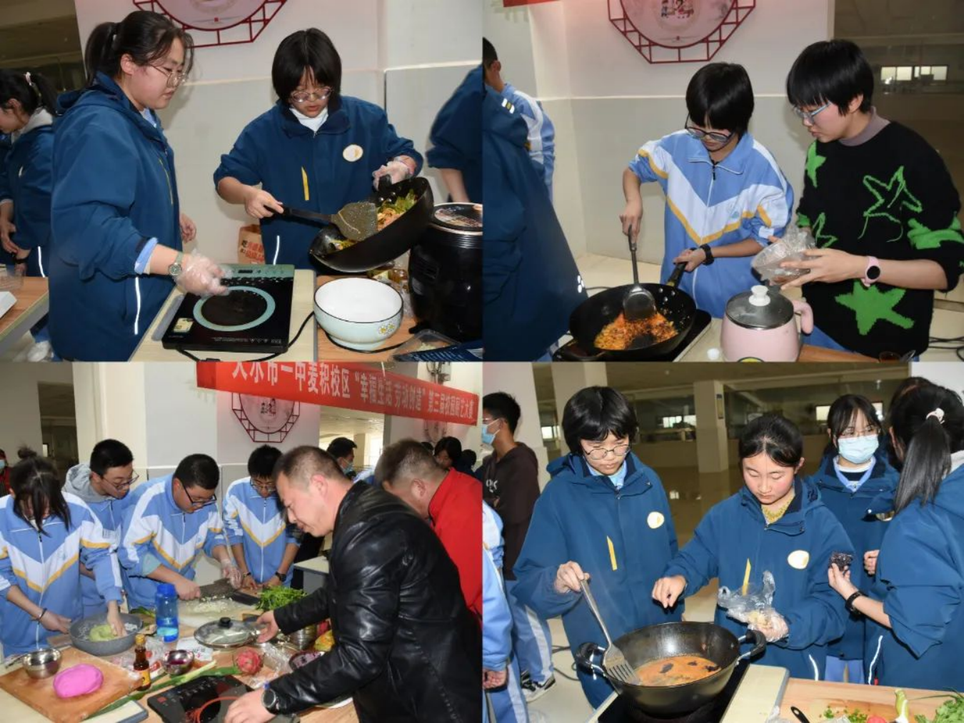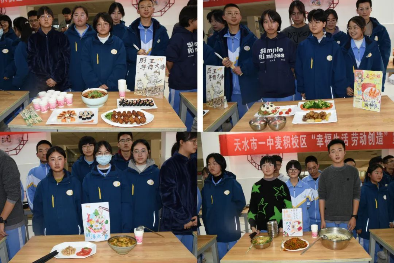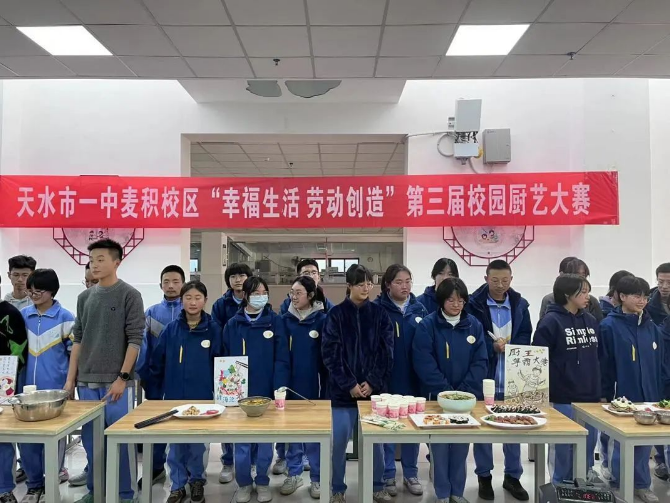 为落实五育并举、立德树人的根本任务,加强同学们对厨艺的了解,锻炼学生的劳动实践能力,在学校的大力支持和各部门的精心组织下,天水市一中麦积校区“幸福生活 劳动创造”第三届校园厨艺大赛"于12月1日下午在麦积校区食堂如期开展。学校领导班子,相关处室负责、级部负责人作为大赛评委出席了本次活动。高一级班主任,各战队参赛选手,学生大众评审团及班级后援团近200人参加了本次活动。