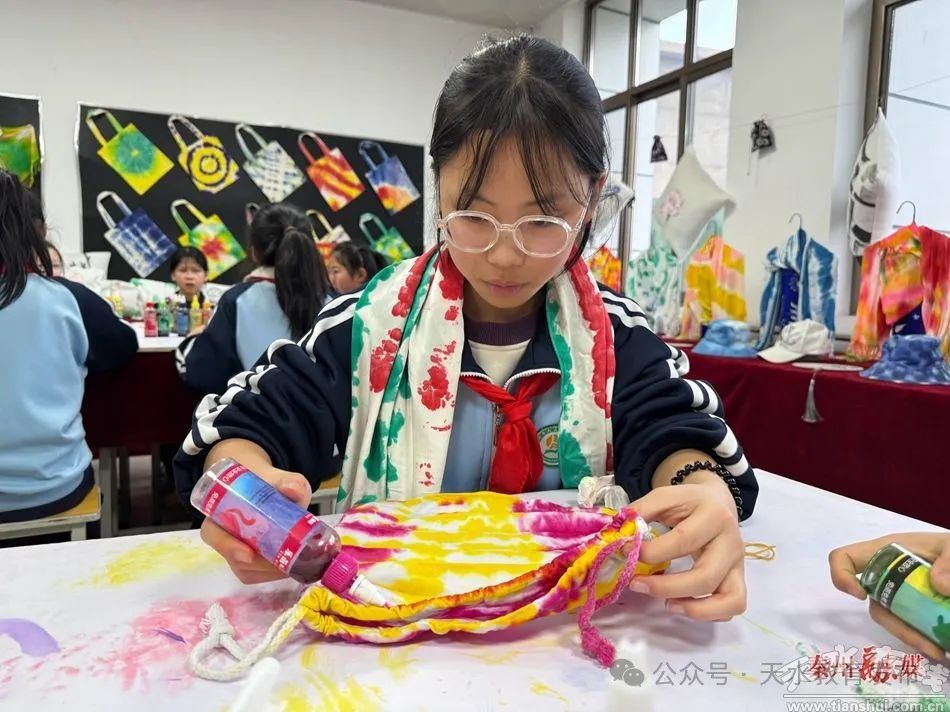 秦州区融媒体中心3月19日讯(记者 赵婷)由染而生,布里生花。近日,天水市人民路小学将非遗文化扎染技艺引入校园社团课堂,让学生在“一扎一染”中感受传统工艺魅力的同时,进一步丰富了学生校园文化生活。