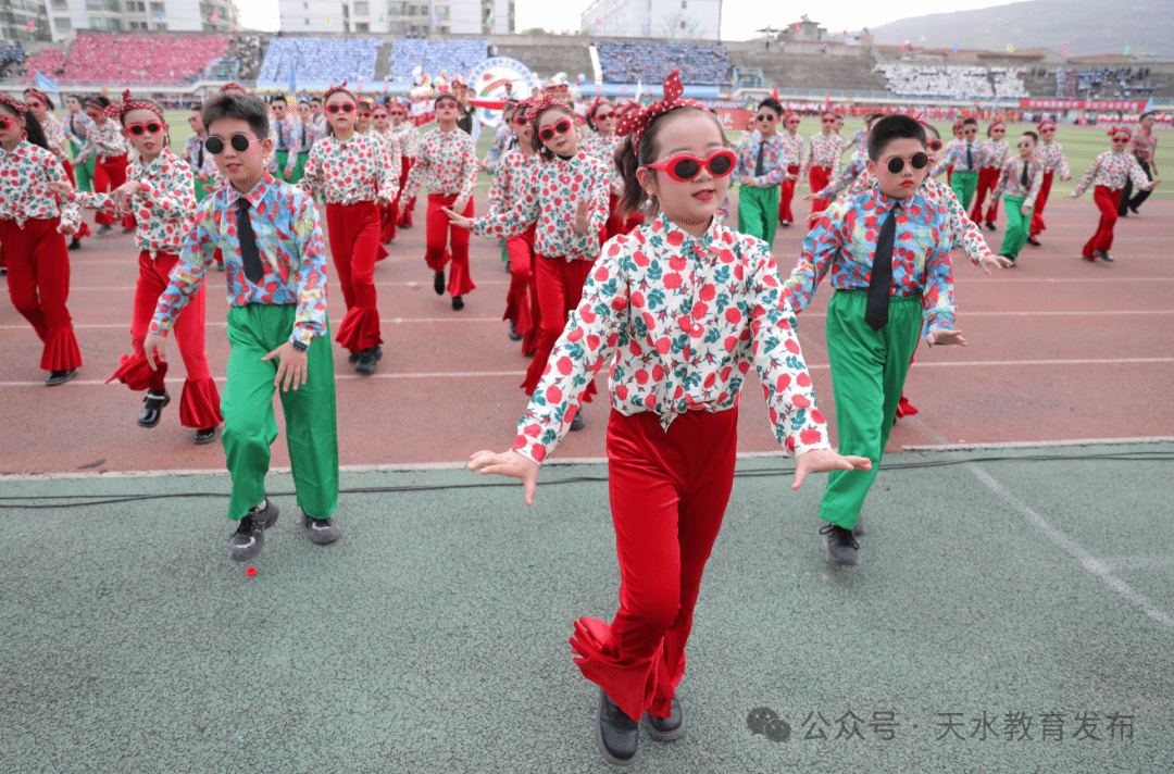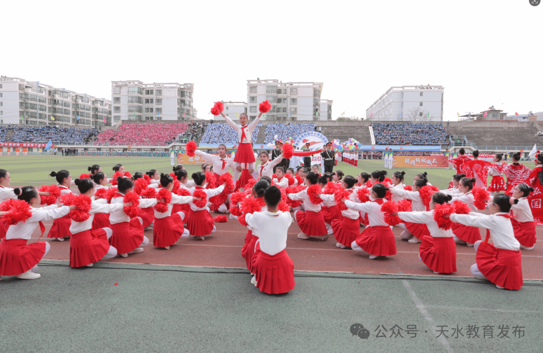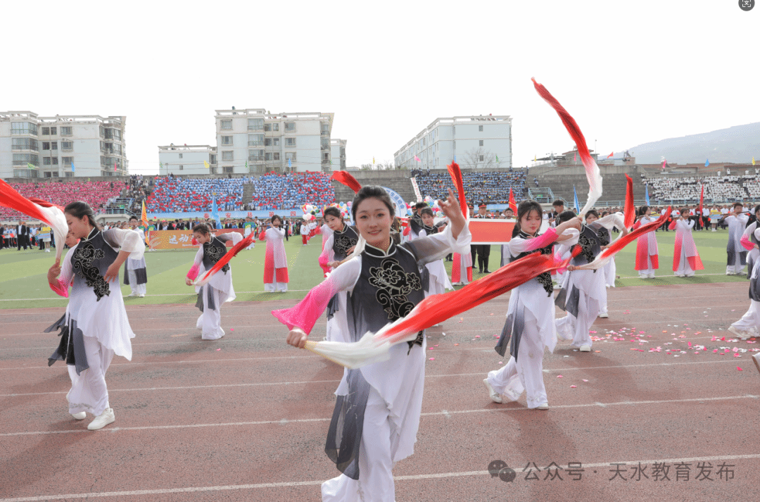 小学教育联盟、初中教育联盟、县一中、县二中、县四中、县五中高中部、县职校等16个代表队约4000人,分七个方阵表演团体操《盛世花开,同心筑梦》《在灿烂的阳光下》、篮球操《迎难而上 点亮梦想》、韵律操《龙腾娲乡,青春跃动》、创意健美操《操舞飞扬,运动让生命更精彩》和教师代表队表演团体操《春风化雨,师舞风华 》等,最后来自秦安五中的800名同学组成的节目《青春跃影,律动华章》把开幕式节目表演推向高潮。