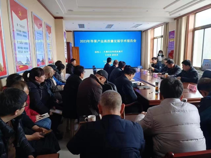 调研期间,天津市林果产业体系首席专家王芝学研究员以“2023年苹果产业高质量发展”为题作了学术报告,介绍了国内外苹果产业发展现状,围绕提质增效、节本增效、增产增收、采后增效及产业融合发展等目标,提出了应用新品种、做好果园规划、精细化花果管理、水肥调控及质量安全等推进苹果产业高质量发展的措施,50多名技术人员参加了报告会。