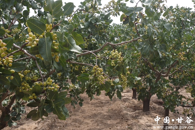 立秋过后,中国开心果科普示范基地里的开心果开始逐渐由绿变红,一穗穗开心果挂满了枝头,长势喜人,不日即将成熟,丰收在望。
