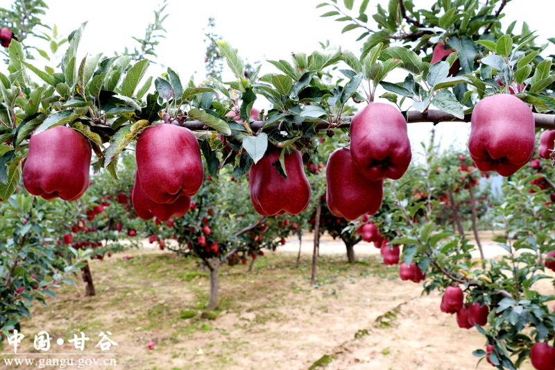 甘谷花牛苹果,果面红黑透亮,果型端正高桩,果肉脆甜多汁,果香浓郁芬芳,硬度适中,香甜可口,是天水花牛苹果中的精品,先后被评为“农业部优质农产品”、“甘肃省优质农产品”、“深圳国际水果鉴评会水果状元”、“中华名果”、“中国名优产品金奖”、“中国名优果品金质奖”等多项荣誉称号。目前,全县苹果面积36万亩,年产量60万吨以上,建有国家级苹果标准园1个,省级苹果标准园14个,完成苹果商标注册54个、苹果绿色认证9个。